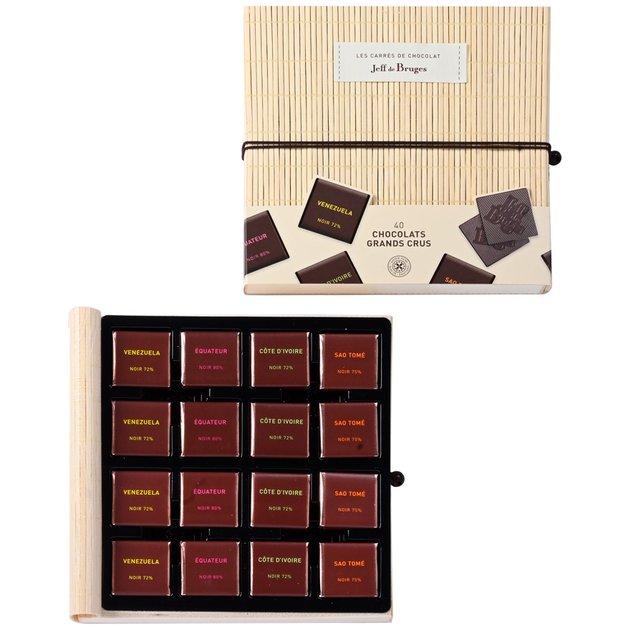 60 carrés disposés dans un joli coffret en bambou, que vous pourrez déguster lors d’une pause gourmande bien méritée. Pour les amateurs de chocolat noir, Jeff de Bruges propose un assortiment ‘Grands Crus’ aux cacaos du Venezuela (72% de cacao), de Sao Tomé et de Côte d’ivoire (75% de cacao) ou encore d’Equateur 80% de cacao…