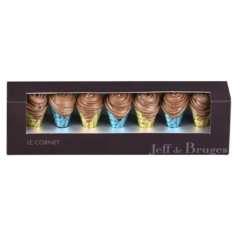 Laissez-vous tenter par ces délicieux cornets aux saveurs exquises : gianduja tendre aux noisettes et amandes et gianduja aux noisettes et aux éclats croustillants de crêpe dentelle.