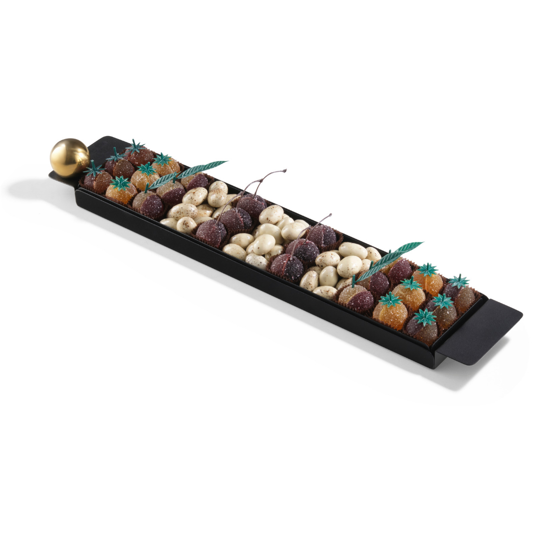 Ingrédients : chocolat noir (masse de cacao aux fèves de cacao d’Equateur, sucre, beurre concentré (LAIT), beurre de cacao, émulsifiant : lécithines de SOJA, arôme naturel de vanille), sucre, chocolat au lait (sucre, LAIT entier en poudre, masse de cacao aux fèves de cacao d’Equateur, beurre de cacao, émulsifiant : lécithines de SOJA, arôme naturel de vanille), chocolat blanc (sucre, beurre de cacao, LAIT entier en poudre, émulsifiant : lécithines de soja, arôme naturel de vanille), NOISETTES, pâte de cacao, beurre de cacao, LAIT entier en poudre, beurre de karité, massepain (sucre, AMANDES, sirop de glucose de maïs et de blé, stabilisant : glycérol de colza, PISTACHES, stabilisant : sorbitols de maïs, arôme naturel de pistache), huile de noix de coco, AMANDES, beurre (LAIT), crème (LAIT), huile de tournesol, éclats de crêpes dentelle (farine de BLÉ, sucre, beurre concentré (LAIT), LACTOSE, protéines de LAIT, sel, farine d’ORGE malté, poudre à lever : carbonates de sodium), caramel (sirop de glucose de maïs et de blé, LAIT concentré sucré (LAIT écrémé, sucre), huile de noix de coco, eau, stabilisant : glycérol de colza, émulsifiants : mono- et diglycérides d’acides gras et lécithines de SOJA, sel, arôme naturel), sirop de glucose de maïs et de blé, stabilisant : glycérol de colza, meringue (sucre, beurre de cacao, amidon de BLÉ, huile de noix de coco, protéines de LAIT, poudres à lever : carbonates de sodium et carbonates d’ammonium, blanc d’OEUF), beurre concentré (LAIT), poudre de cacao dégraissé, éclats de spéculoos (farine de BLÉ, sucre, huile de colza, sirop de sucre candi, beurre concentré (LAIT), poudre à lever : carbonates de sodium, sel, cannelle), stabilisant : sorbitols de blé, confiture de cerises (sirop de glucose et fructose, cerises, sucre, épaississant : pectine, correcteur d’acidité : acide citrique), LAIT écrémé, eau, dextrose, arômes et arômes naturels, poudre de cacao, sirop de sucre inverti, cerises, riz soufflé (farine de riz, sucre, sel, beurre de cacao), émulsifiant : lécithines de SOJA, purée de fruit de la passion (extrait de fruits de la passion, sirop de sucre), fèves de cacao, nougat (sucre, sirop de glucose de maïs et de blé, AMANDES, miel, beurre de cacao, amidon de pomme de terre, blanc d’OEUF, arôme naturel de vanille), noix de coco, sirop de sucre candi, stabilisant : sorbitols de maïs, farine de BLÉ, huile de maïs, café, AMANDES d’abricot, graines de SÉSAME, OEUF, raisins secs, sirop de glucose-fructose, écorces d’oranges confites (écorces d’oranges, sucre, sirop de glucose-fructose, correcteur d’acidité: acide citrique), NOIX de pécan, thé Earl Grey, blanc d’OEUF, extrait sec de citron, sirop de sucre, amidon de BLÉ, épices, sucre caramélisé, cannelle, sel de Guérande, mangue, framboises, coriandre, LAIT écrémé en poudre, sel, correcteur d’acidité : acide citrique, colorant (caramel d’ammonium), extrait de paprika, aliments colorants (concentrés de spiruline, de pomme, de groseille, de radis et caroténoïdes ), jus de citron vert concentré, amidon de tapioca, poudres à lever : carbonates d’ammonium et carbonates de sodium, piment d’Espelette, matière grasse laitière anhydre (LAIT), myrtilles en poudre, huile de citron vert, émulsifiant : lécithine de tournesol, vanille en poudre.