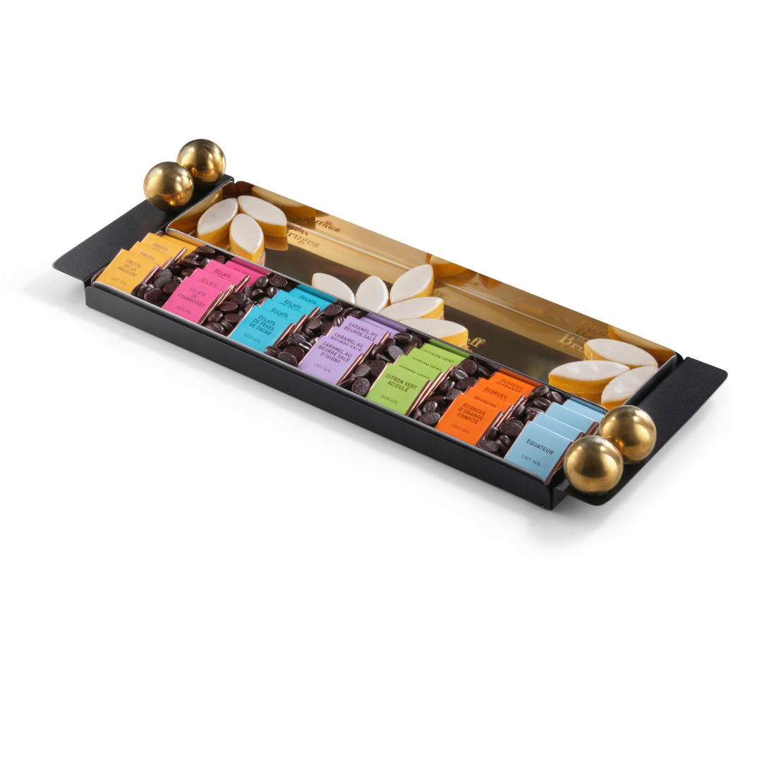 Ingrédients : chocolat noir (masse de cacao aux fèves de cacao d’Equateur, sucre, beurre concentré (LAIT), beurre de cacao, émulsifiant : lécithines de SOJA, arôme naturel de vanille), sucre, chocolat au lait (sucre, LAIT entier en poudre, masse de cacao aux fèves de cacao d’Equateur, beurre de cacao, émulsifiant : lécithines de SOJA, arôme naturel de vanille), chocolat blanc (sucre, beurre de cacao, LAIT entier en poudre, émulsifiant : lécithines de soja, arôme naturel de vanille), NOISETTES, pâte de cacao, beurre de cacao, LAIT entier en poudre, beurre de karité, massepain (sucre, AMANDES, sirop de glucose de maïs et de blé, stabilisant : glycérol de colza, PISTACHES, stabilisant : sorbitols de maïs, arôme naturel de pistache), huile de noix de coco, AMANDES, beurre (LAIT), crème (LAIT), huile de tournesol, éclats de crêpes dentelle (farine de BLÉ, sucre, beurre concentré (LAIT), LACTOSE, protéines de LAIT, sel, farine d’ORGE malté, poudre à lever : carbonates de sodium), caramel (sirop de glucose de maïs et de blé, LAIT concentré sucré (LAIT écrémé, sucre), huile de noix de coco, eau, stabilisant : glycérol de colza, émulsifiants : mono- et diglycérides d’acides gras et lécithines de SOJA, sel, arôme naturel), sirop de glucose de maïs et de blé, stabilisant : glycérol de colza, meringue (sucre, beurre de cacao, amidon de BLÉ, huile de noix de coco, protéines de LAIT, poudres à lever : carbonates de sodium et carbonates d’ammonium, blanc d’OEUF), beurre concentré (LAIT), poudre de cacao dégraissé, éclats de spéculoos (farine de BLÉ, sucre, huile de colza, sirop de sucre candi, beurre concentré (LAIT), poudre à lever : carbonates de sodium, sel, cannelle), stabilisant : sorbitols de blé, confiture de cerises (sirop de glucose et fructose, cerises, sucre, épaississant : pectine, correcteur d’acidité : acide citrique), LAIT écrémé, eau, dextrose, arômes et arômes naturels, poudre de cacao, sirop de sucre inverti, cerises, riz soufflé (farine de riz, sucre, sel, beurre de cacao), émulsifiant : lécithines de SOJA, purée de fruit de la passion (extrait de fruits de la passion, sirop de sucre), fèves de cacao, nougat (sucre, sirop de glucose de maïs et de blé, AMANDES, miel, beurre de cacao, amidon de pomme de terre, blanc d’OEUF, arôme naturel de vanille), noix de coco, sirop de sucre candi, stabilisant : sorbitols de maïs, farine de BLÉ, huile de maïs, café, AMANDES d’abricot, graines de SÉSAME, OEUF, raisins secs, sirop de glucose-fructose, écorces d’oranges confites (écorces d’oranges, sucre, sirop de glucose-fructose, correcteur d’acidité: acide citrique), NOIX de pécan, thé Earl Grey, blanc d’OEUF, extrait sec de citron, sirop de sucre, amidon de BLÉ, épices, sucre caramélisé, cannelle, sel de Guérande, mangue, framboises, coriandre, LAIT écrémé en poudre, sel, correcteur d’acidité : acide citrique, colorant (caramel d’ammonium), extrait de paprika, aliments colorants (concentrés de spiruline, de pomme, de groseille, de radis et caroténoïdes ), jus de citron vert concentré, amidon de tapioca, poudres à lever : carbonates d’ammonium et carbonates de sodium, piment d’Espelette, matière grasse laitière anhydre (LAIT), myrtilles en poudre, huile de citron vert, émulsifiant : lécithine de tournesol, vanille en poudre.